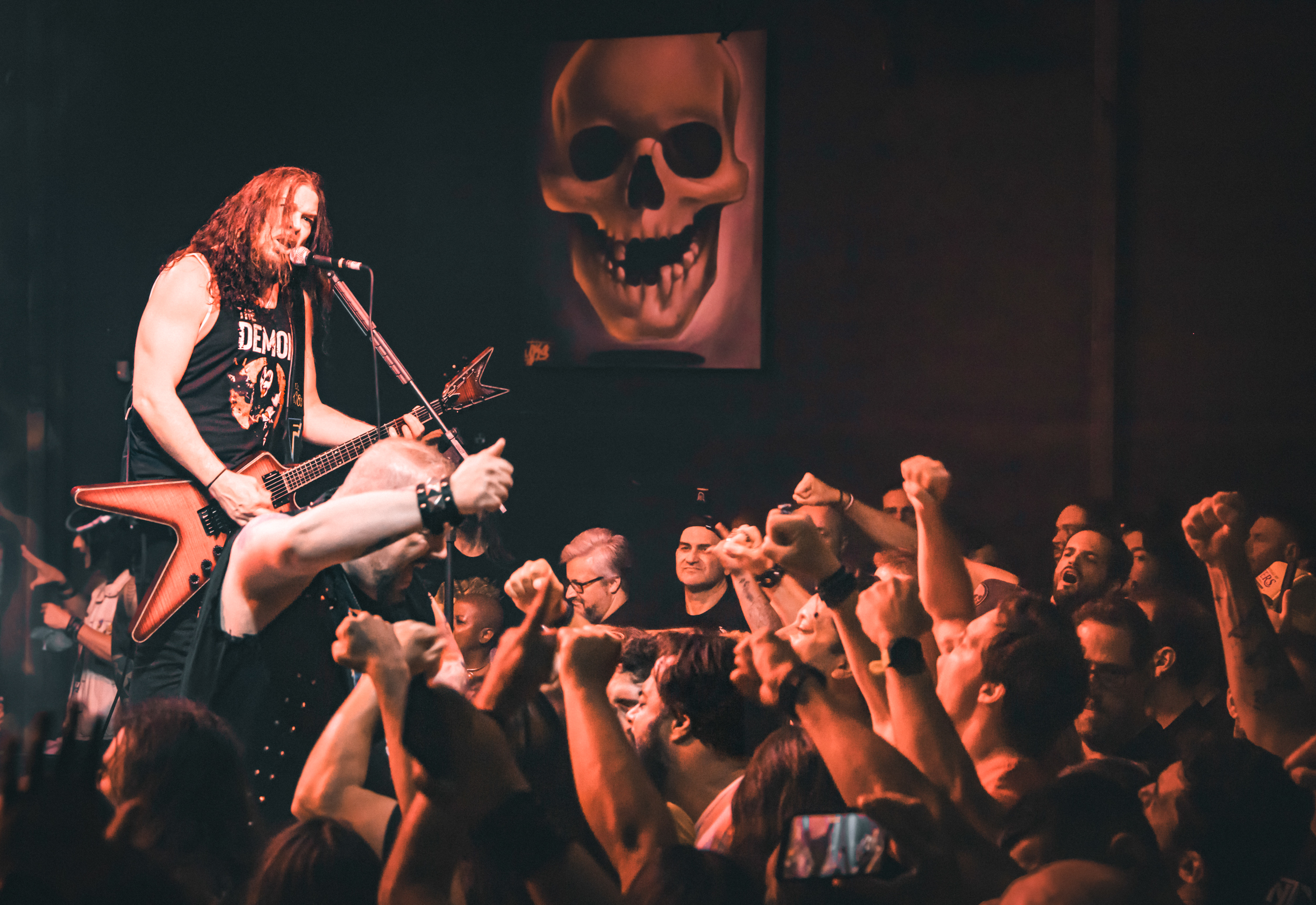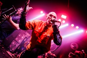 A presença de palco de Sean Killian foi um espetáculo à parte. Dominando o espaço com naturalidade, o vocalista conduziu o show com carisma e entrega total. A banda inteira demonstrava diversão genuína, trocando sorrisos entre si e com o público, reforçando o clima de celebração. Sean, em especial, foi além da interação tradicional. Desceu até a grade, apertou mãos, encarou o público de perto e criou uma conexão tão intensa que dava a impressão — quase surreal — de que ele estava olhando diretamente nos olhos de cada pessoa ali presente. Vestindo sua marcante camisa laranja, prendeu a atenção não apenas pelo visual chamativo, mas principalmente pela força de sua atuação. Arrisco dizer que ele foi o catalisador da catarse coletiva. A plateia assistia hipnotizada, enquanto a pista fervia: mosh pits se formavam, corpos eram erguidos e carregados por uma onda de energia brutal e contagiante. Desde os primeiros riffs, ficou claro que não havia espaço para respiro.
