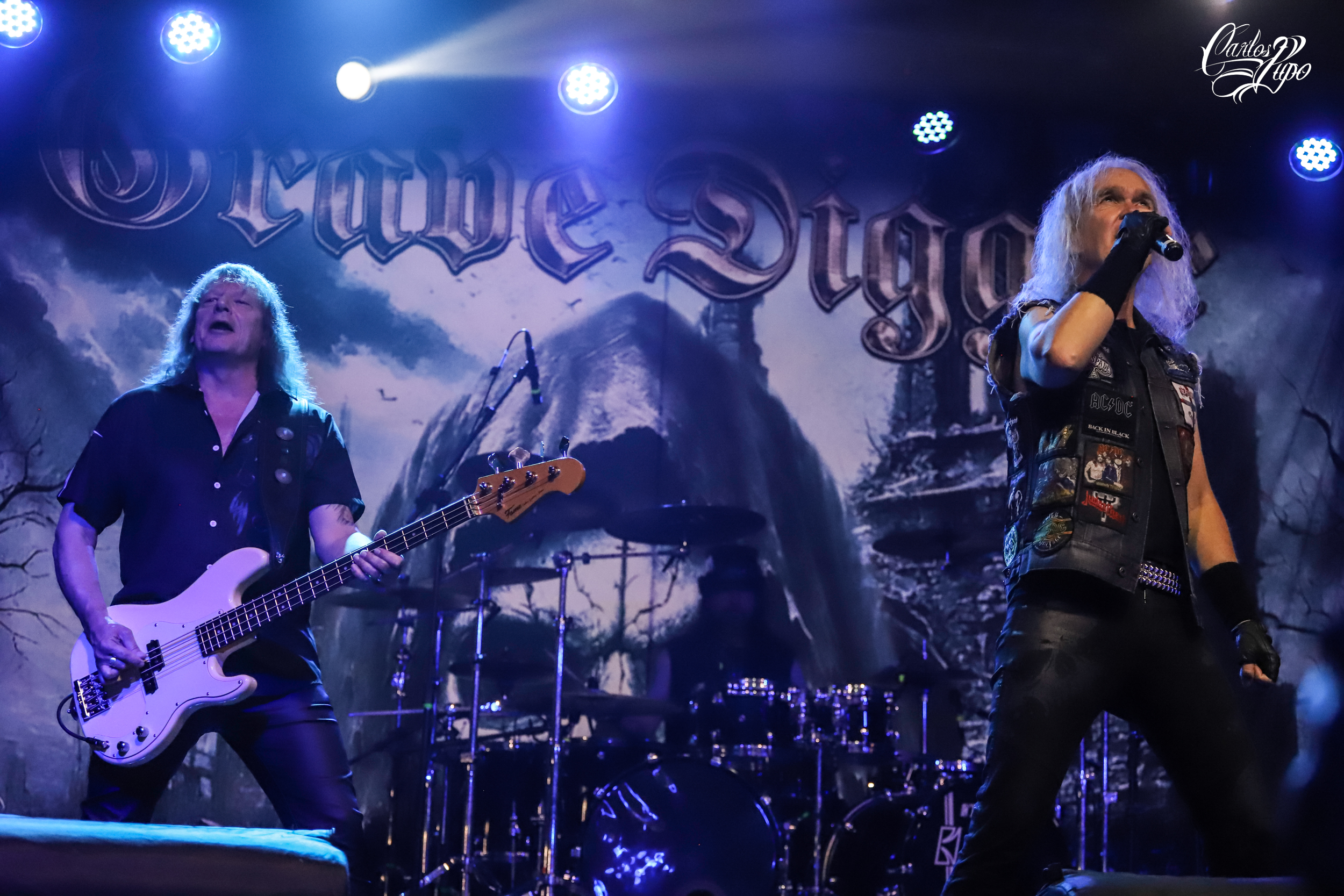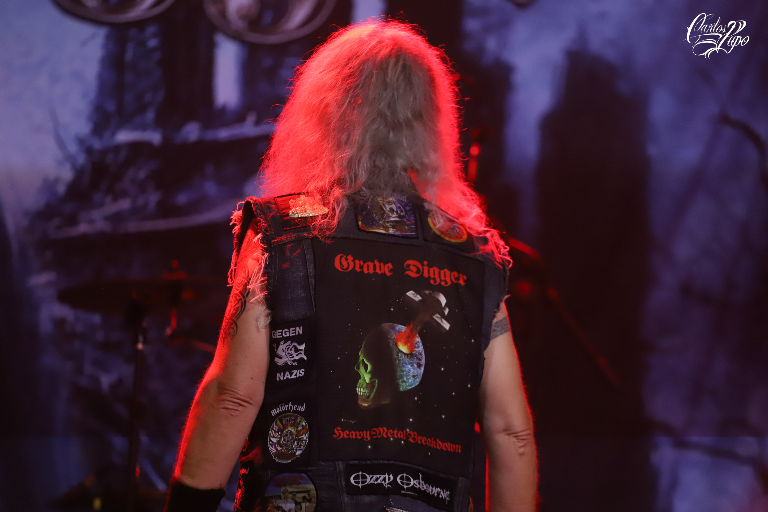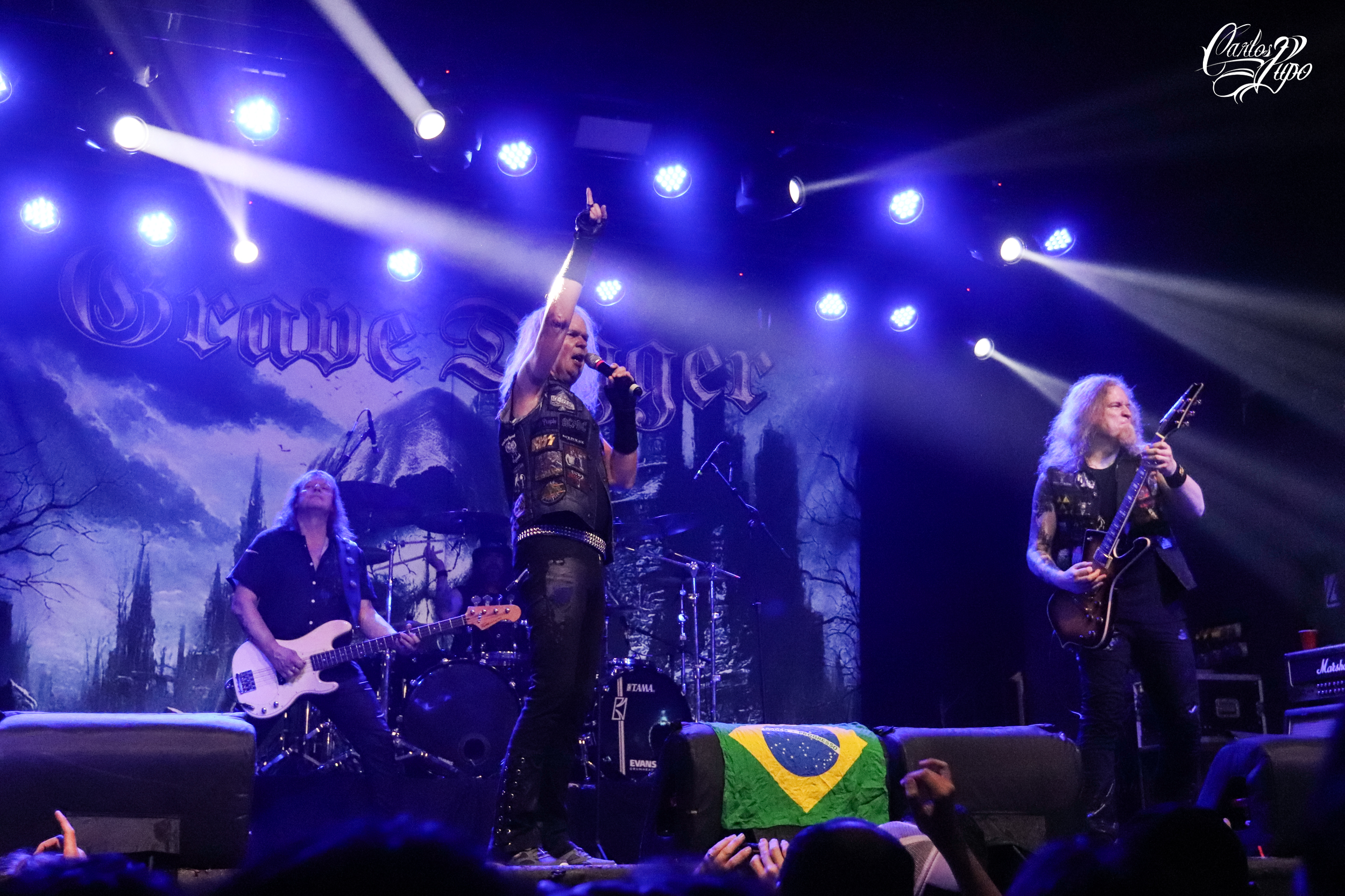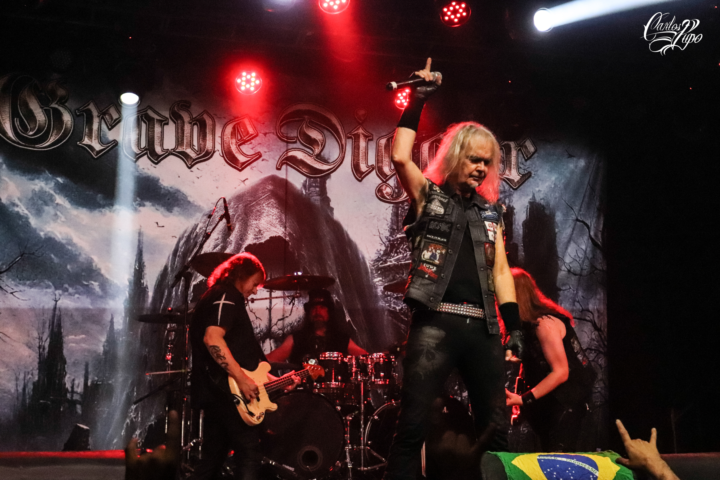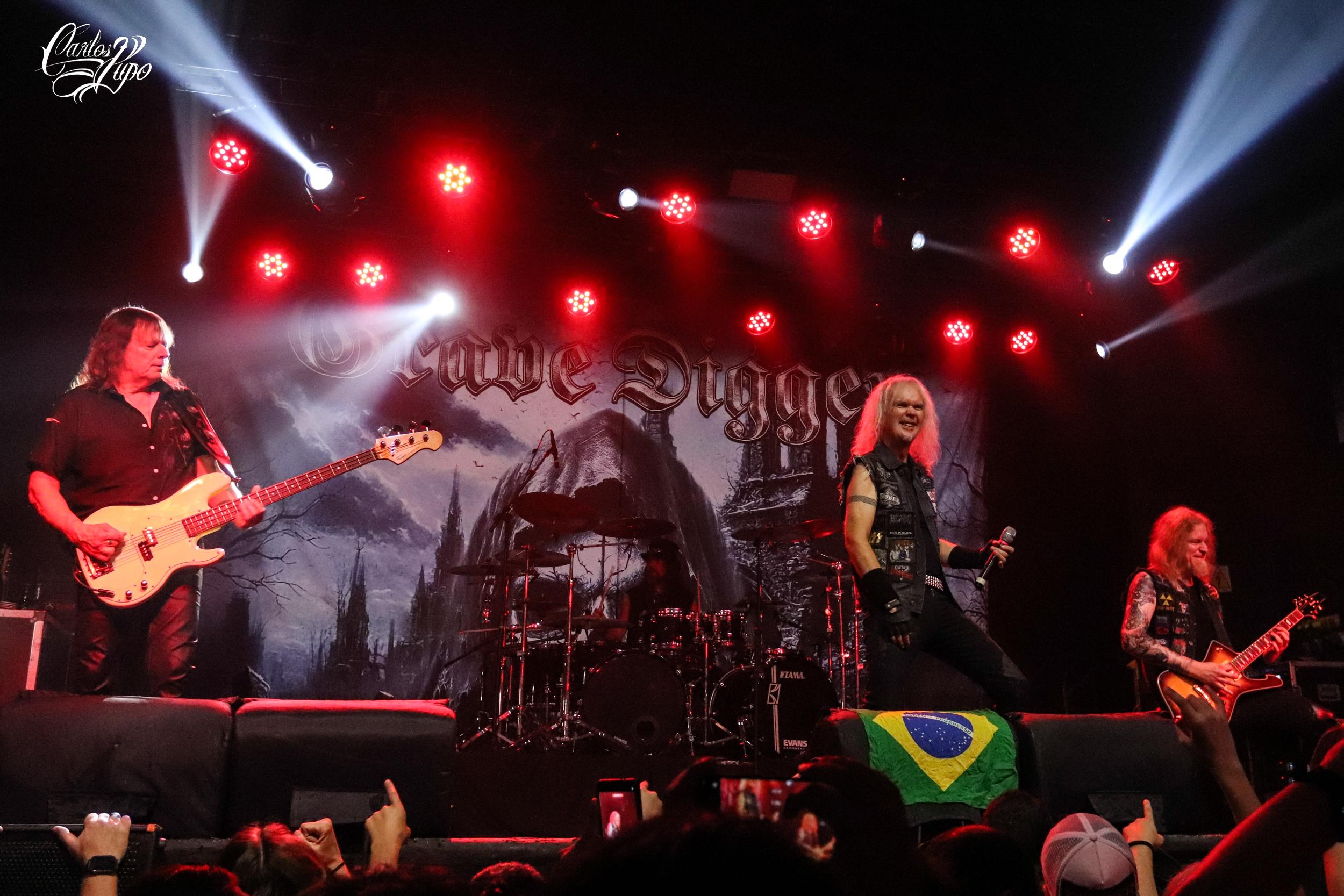 Cerca de trinta minutos após o espetáculo dos paulistanos, as luzes se apagaram e um rugido coletivo tomou conta do Carioca Club. Grave Digger, liderado por Chris Boltendahl, surgiu diante de uma plateia ensandecida — um encontro entre lenda e devoção. Ao lado de Chris estavam Jens Becker (baixo), Markus Kniep (bateria) e Tobias Kärsten (guitarra), formando uma engrenagem afiada e implacável.