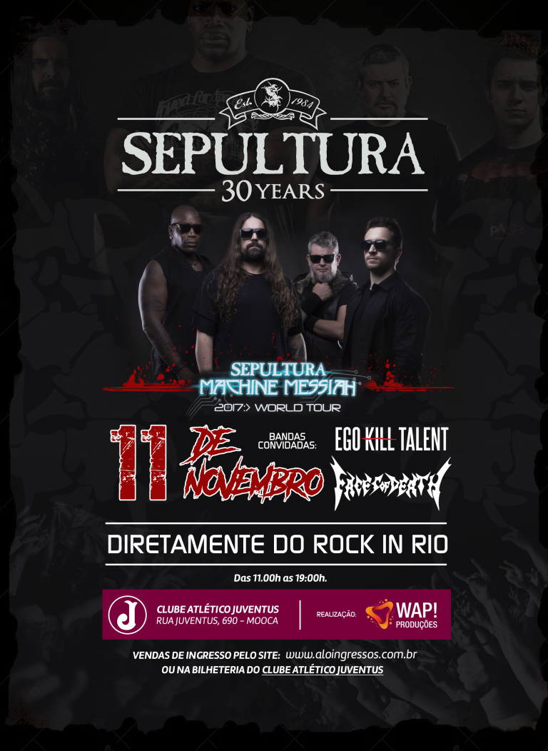 Show do Sepultura no Clube Atlético Juventus, no dia 11 de novembro, como parte da turnê do novo álbum “Machine Messiah”.