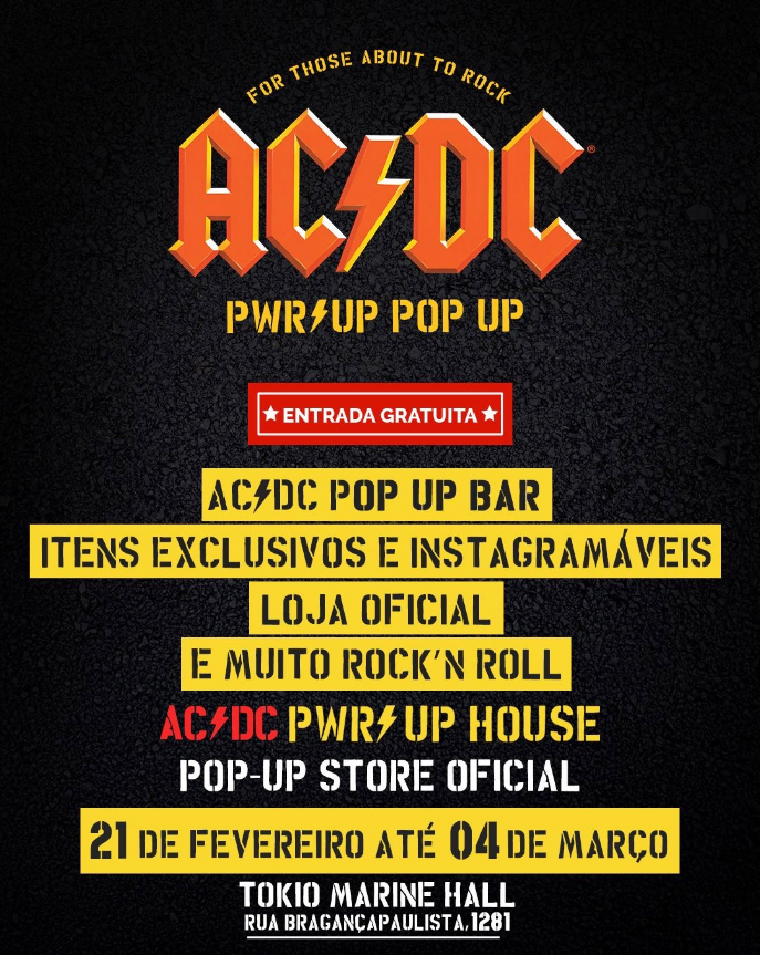 A experiência AC/DC PWR UP House chega a São Paulo para uma temporada gratuita entre os dias 21 de fevereiro e 4 de março, no Tokio Marine Hall. A ativação ocorre durante a passagem da banda AC/DC pelo Brasil e funciona diariamente, das 12h às 20h. Nos dias de shows, em 24 e 28 de fevereiro e 4 de março, o horário será estendido das 10h às 20h. Em 3 de março, o espaço abre das 10h às 16h.