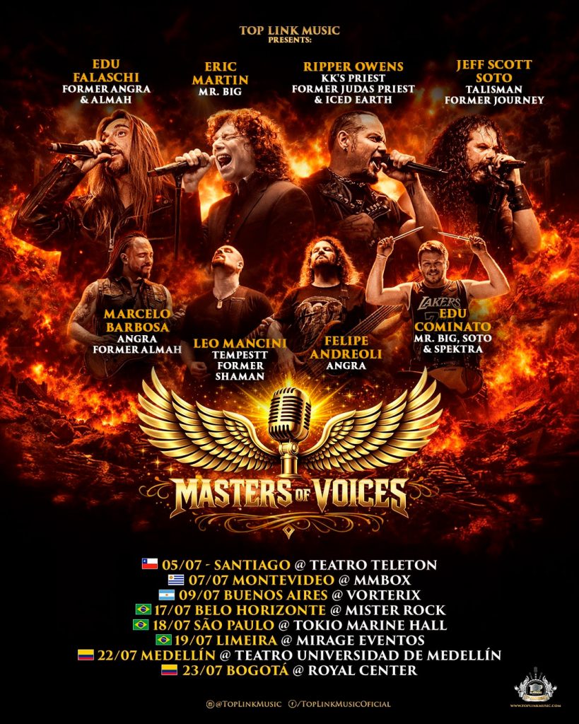 Idealizado por Paulo Baron, da Top Link Music, o Masters Of Voices 2026 reúne quatro grandes vozes da história do rock: Eric Martin (Mr. Big), Jeff Scott Soto (Talisman, Journey, Yngwie Malmsteen), Edu Falaschi (Angra, Almah) e Tim “Ripper” Owens (Judas Priest, KK’s Priest, Iced Earth).
