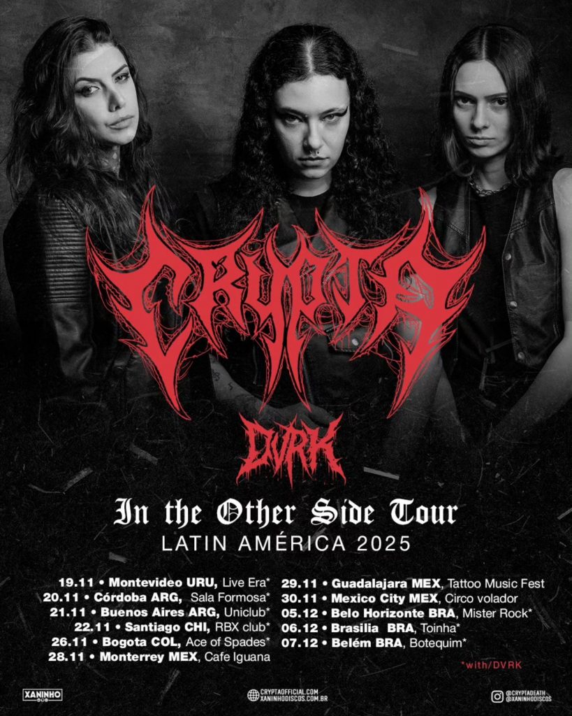 Depois de realizar mais uma tour pelos EUA, a Crypta anuncia a “In the Other Side Tour – Latin America”, com 11 datas, passando por países como Uruguai, Argentina, Chile, Colômbia, México e Brasil. A banda francesa Dvrk será suporte em todos os shows – exceto nas três datas no México.