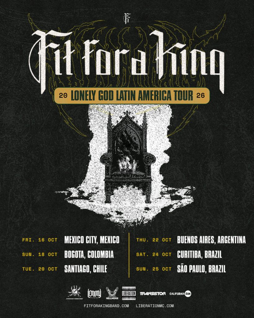 A banda norte-americana de metalcore Fit for a King faz a aguardada estreia no Brasil em outubro deste ano, com shows em Curitiba (24/10, Jokers) e São Paulo (25/10, Carioca Club), em turnê que divulga Lonely God, o oitavo álbum de estúdio. A realização é da Liberation Music Company.