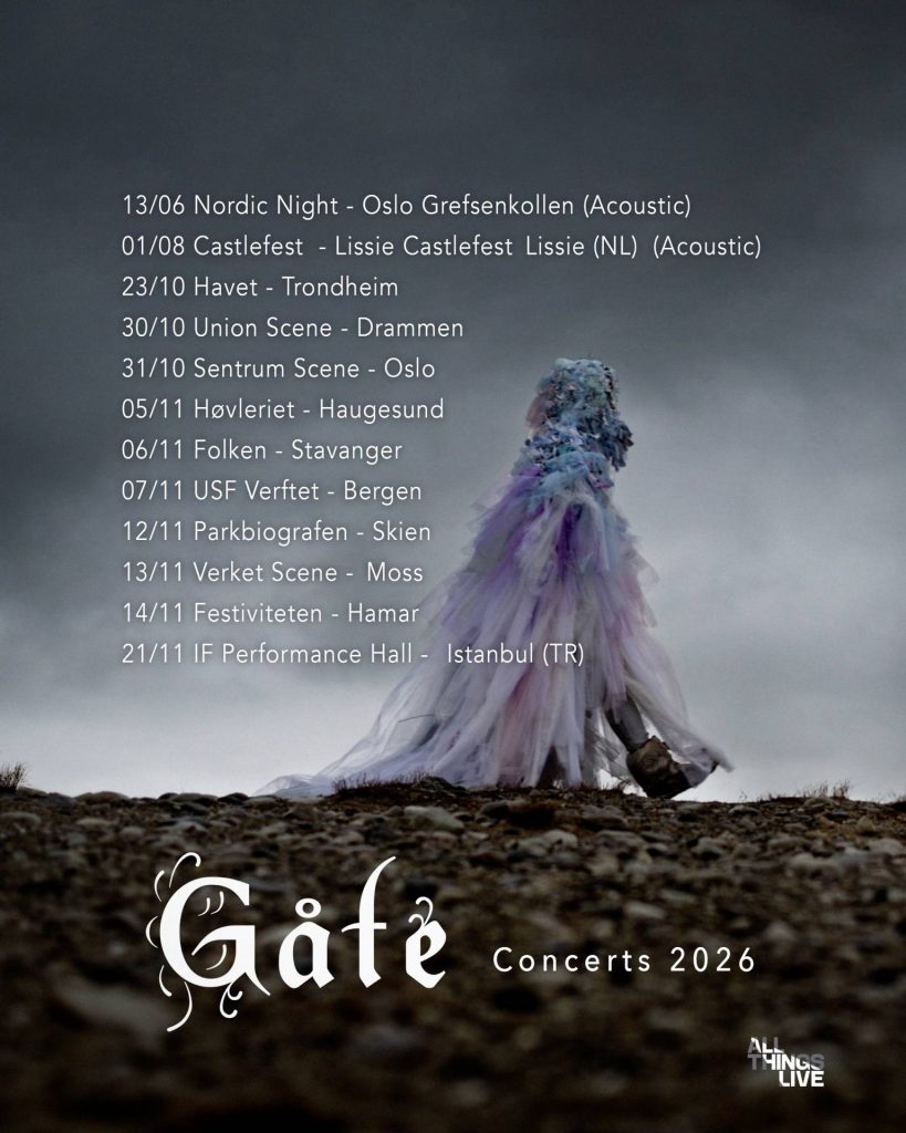 Antes disso, o Gåte fará apresentações acústicas em festivais. Uma delas será no Castlefest, na Holanda, em 1º de agosto. Outra acontece em Oslo, em 13 de junho, como convidado especial do Wardruna no evento Nordic Night.