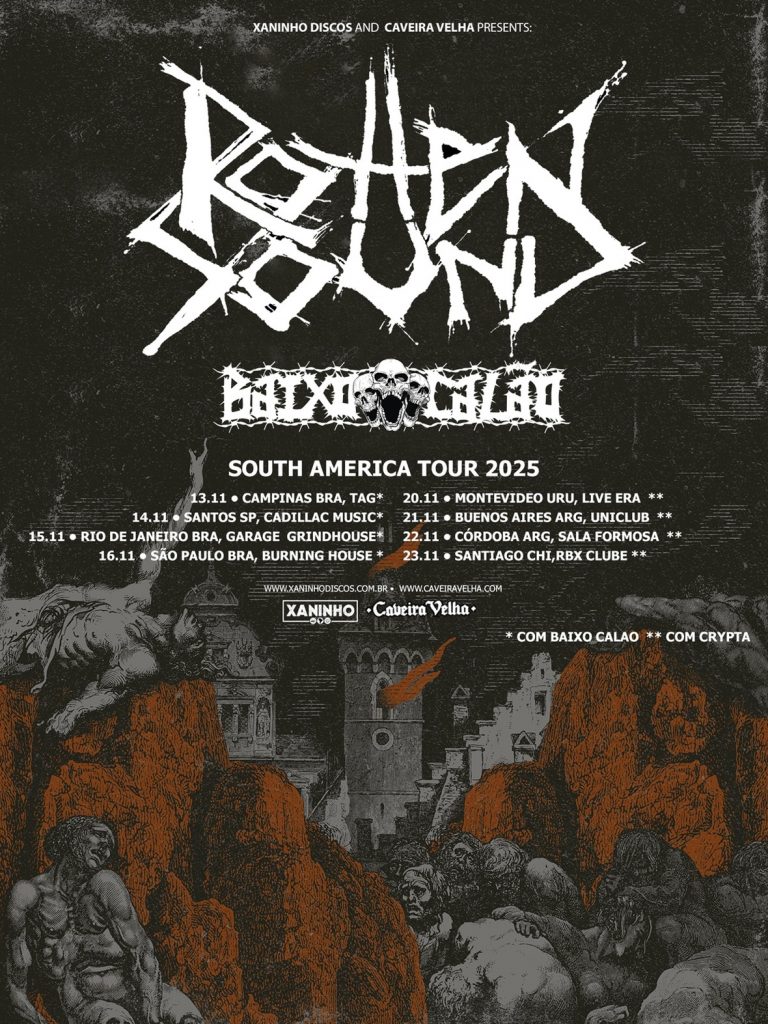 Os finlandeses do Rotten Sound, uma das forças do grindcore mundial desde 1993, desembarcam na América do Sul em novembro deste ano para oito apresentações, entre elas, quatro no Brasil com a participação da banda nacional de grindcore Baixo Calão. A realização da parte nacional da turnê é da Xaninho Discos em parceria com a Caveira Velha.