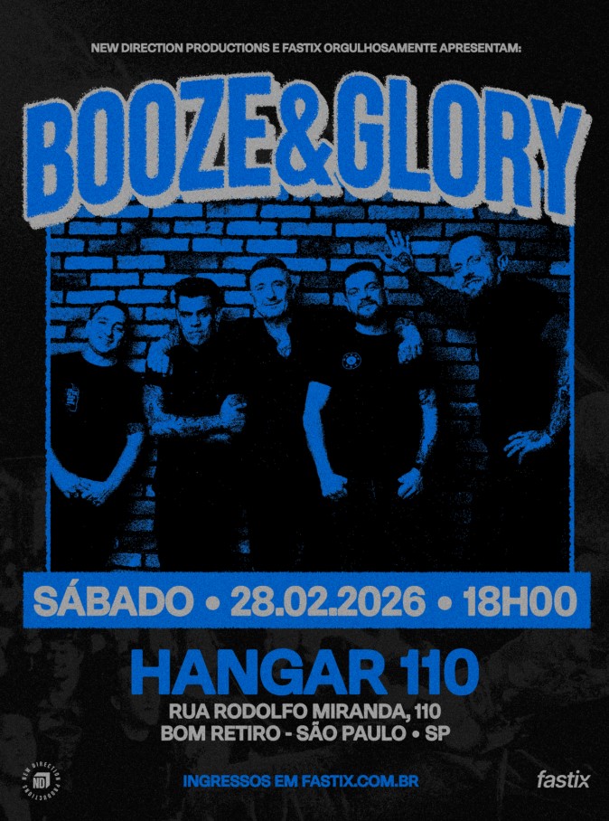 A banda britânica Booze & Glory retorna ao Brasil em 2026 para um show único em São Paulo, no dia 28 de fevereiro, no Hangar 110. A apresentação tem realização da ND Productions em parceria com a Fastix e integra a turnê de divulgação do novo álbum, Whiskey, Tango & Foxtrot.