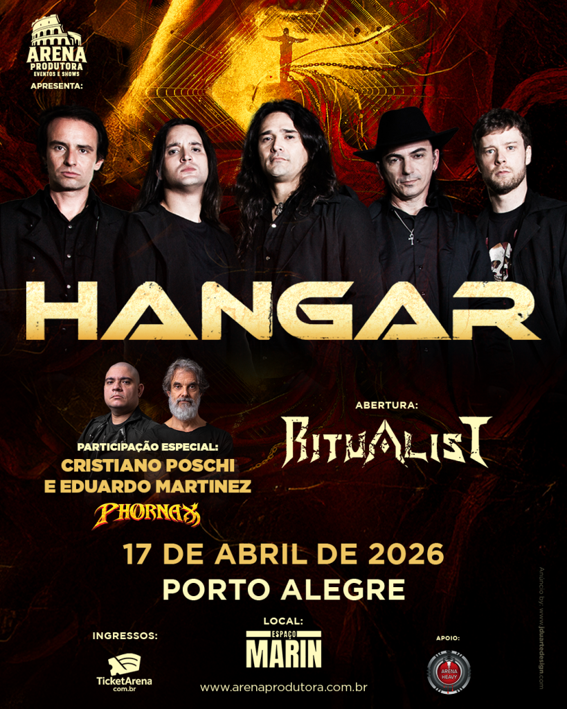 Com Pedro Campos nos vocais, Fabio Laguna nos teclados, Cristiano Wortmann e Eduardo Martinez nas guitarras, Nando Mello no baixo e Aquiles Priester na bateria, o Hangar prepara um show muito especial, celebrando a trajetória consolidada de uma das maiores bandas de Heavy Metal do Brasil. Sobre este retorno do Hangar aos palcos, Rogério Reis comenta: “Tocar ao lado destas verdadeiras referências do Metal gaúcho é uma honra, e agradecemos o convite da Arena pela oportunidade. Neste show apresentaremos músicas deste novo trabalho, que ao vivo ganharão uma dimensão muito maior daquela registrada em estúdio, mostrando esta nova fase da banda. Aguardaremos todos lá”.