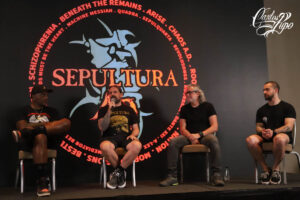 - Andreas Kisser, Derrick Green, Eloy Casagrande e Paulo Jr em entrevista coletiva do 40° Aniversário do Sepultura. A nova turnê chamada “Celebrating Life Through Death”, começa em 1° de março de 2024 em Belo Horizonte (MG). Conforme o grupo revelou, esta turnê encerrará a carreira do Sepultura. Foto: Carlos Pupo