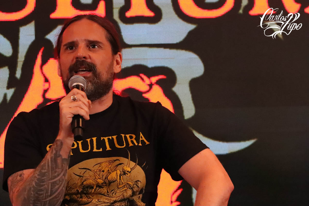 - Gastão Moreira apresenta a entrevista coletiva do 40° Aniversário do Sepultura. A nova turnê chamada “Celebrating Life Through Death”, começa em 1° de março de 2024 em Belo Horizonte (MG). Conforme o grupo revelou, esta turnê encerrará a carreira do Sepultura. Foto: Carlos Pupo
