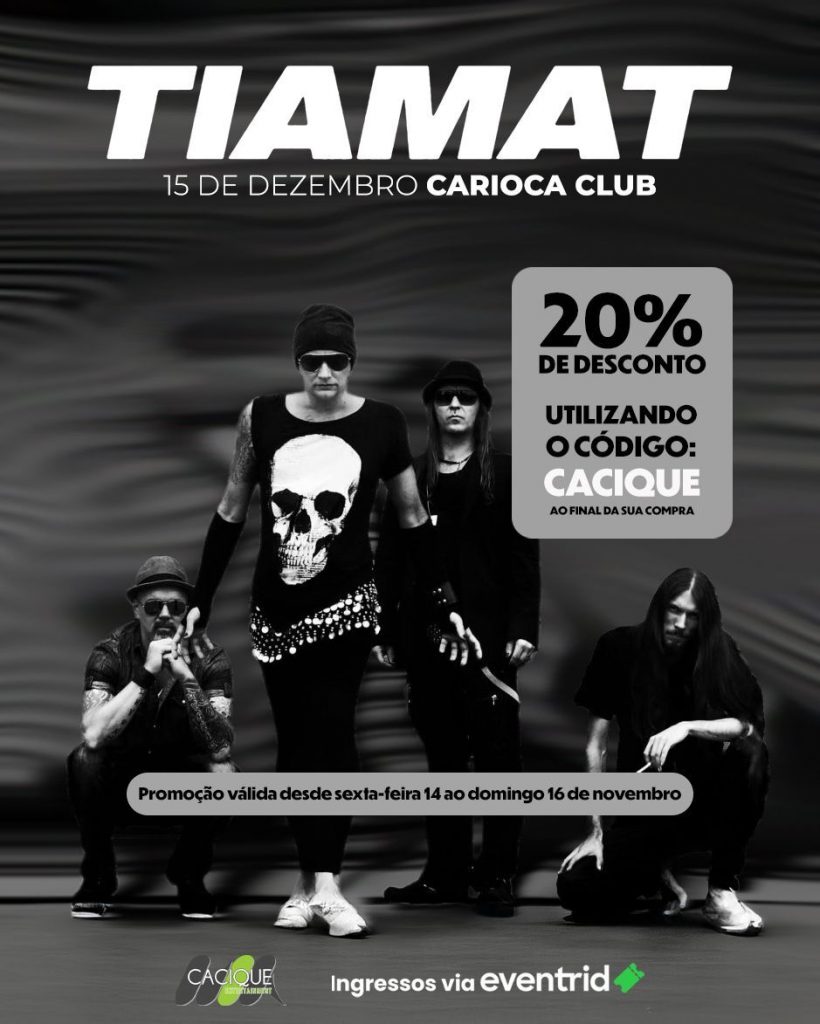 Para celebrar a contagem regressiva, a produtora Cacique Entertainment, responsável por todos os shows do Tiamat na América Latina, liberou um cupom de 20% de desconto válido por tempo limitado (de 14 a 16/11) na compra de ingressos. Para ter o desconto, utilize o código ‘Cacique’ ao final da compra: https://eventr.id/0034PmFS
